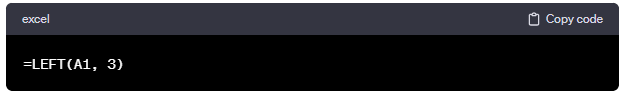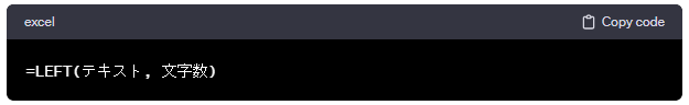 例えば、A1セルに「Excelの使い方」というテキストがある場合、以下のようにLEFT関数を使用して左端から3文字を抽出する式は次の通りです: