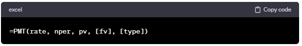 rate: 各支払い期間ごとの利率。nper: 総支払い回数。pv: 現在価値、またはローンや投資の初期金額。[fv]: 未来価値。省略可能で、通常0に設定します。[type]: 支払いのタイプ。省略可能で、0または1を指定。0は期首払い、1は期末払い。