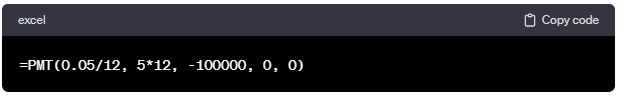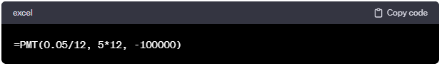 この例では、年利率が5%で、期間が5年のローンで、初期金額が100,000ドルの場合の月々の支払額を計算しています。