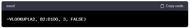 =VLOOKUP(A2, B2:D100, 3, FALSE)