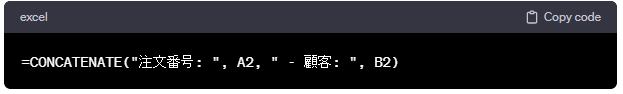 =CONCATENATE("注文番号: ", A2, " - 顧客: ", B2)